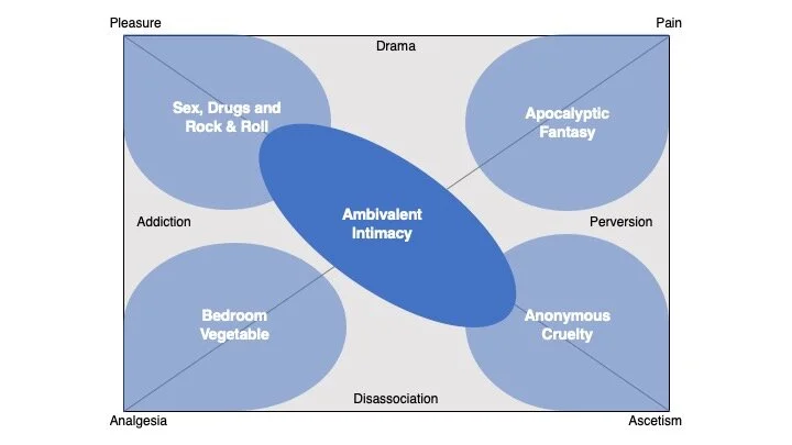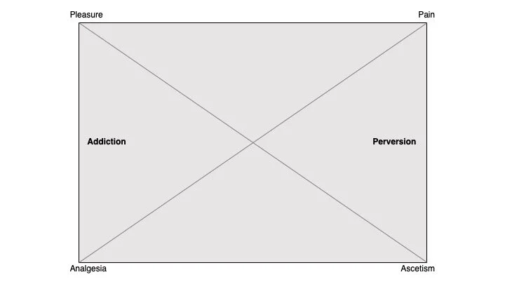 Perversion twists the bad into good, reframing pain as pleasure. Often a response to trauma and feelings of powerlessness. Fetishising the self and others, playing roles to escape the real self, inviting negative moral judgment.