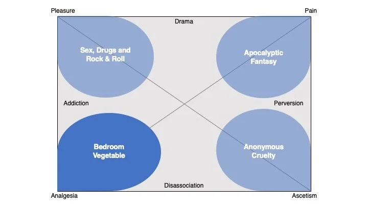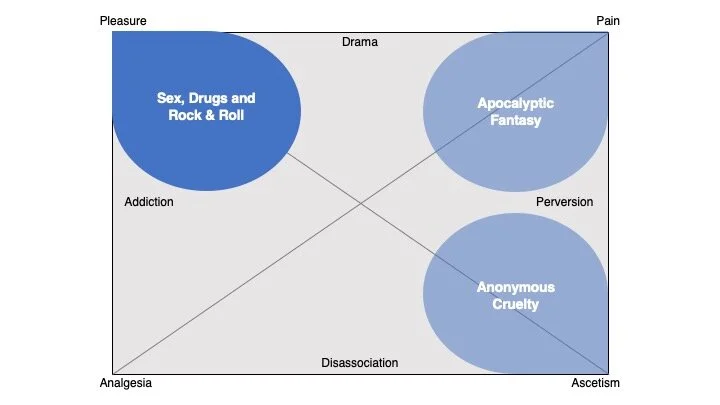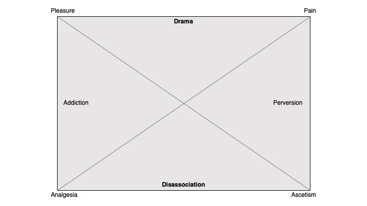 Analgesia serves our desire to not feel pain, at any cost. Whether the relief is delivered through morphine or a good movie, we escape reality and celebrate hedonism. But not without cos. We can create a viscous cycle of not acknowledging pain, therefore creating deep psychological pain, or being so out of it to lose life entirely.