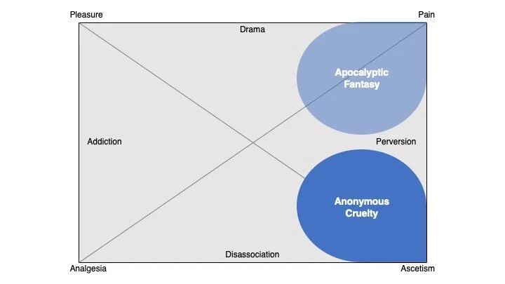 Anonymous Cruelty is a clear move toward asceticism, the pleasure of doing good, being responsible, and becoming the light of the world. Detachment helps one choose more wisely, rather than from pure instinct. But there is a risk in the shadow, of not experiencing the emotional consequences of our actions and taking pleasure in shaming others. In Generation Poetry, we see this through the online bullying and cruelty that would be unthinkable in “real life.” But this generation also shows more vulnerability online, opening themselves up for abuse, in what looks like a perverted game of victim and perpetrator. The instinctive pleasures and passions of the body are denied, but served through a distorted cruelty.